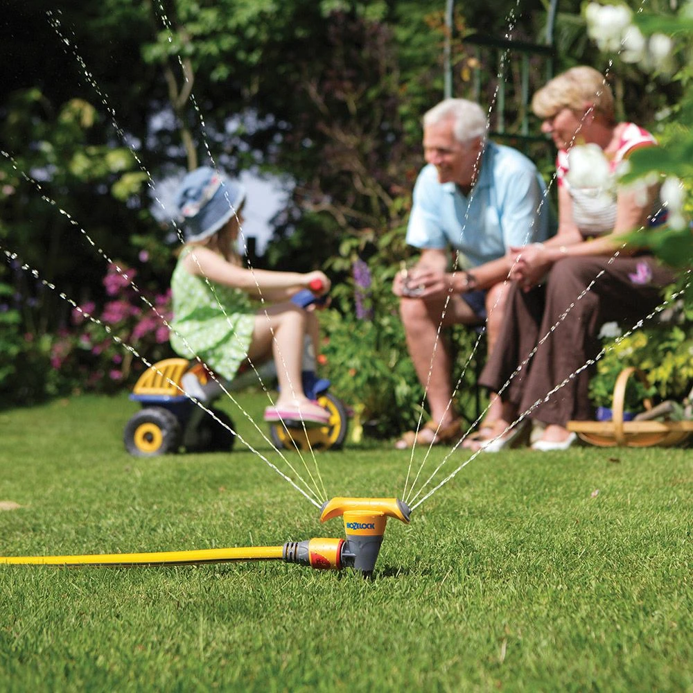 This Round Sprinkler from Hozelock covers an area of 177 sqm and is used by spiking into your lawn. The eater covers the area in circular shapes up to a distance of 15m.