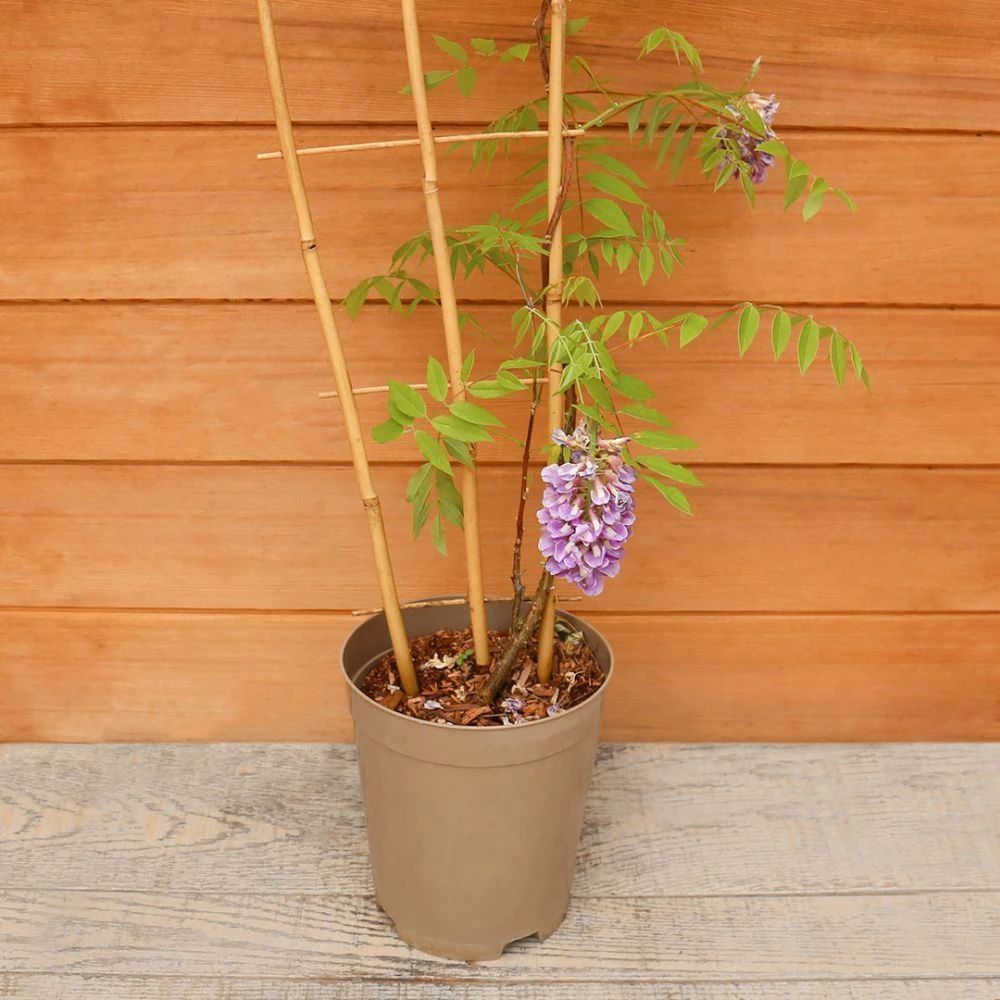 Wisteria are vigorous climbers that are perfect for decorating your garden with delightful colour in late spring and early summer. Ideal for climbing trellis or walls, Amethyst Falls produces fragrant flowers of purple-blue alongside green foliage. Prune new growth in late summer to help maintain shape and growing area. Preferring well-drained soil and a full sun position, this plant can reach a potential height of 5m with a potential spread of 3m. This plant is grown on a trellis giving you instant impact within your garden.